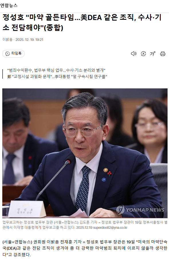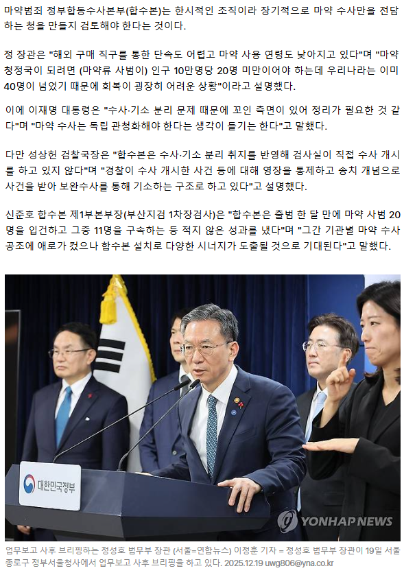 정성호 "마약 골든타임… 美DEA 같은 조직, 수사·기소 전담해야" (종합)