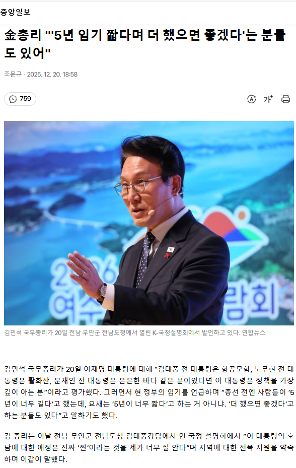 金총리 "'5년 임기 짧다며 더 했으면 좋겠다'는 분들도 있어" ㅡ 4년 중임제 개헌 해야