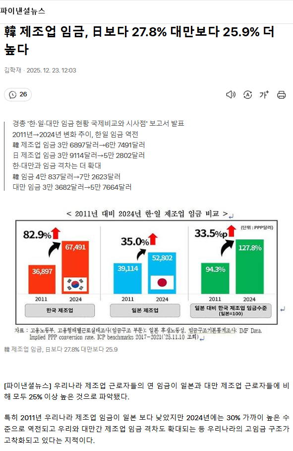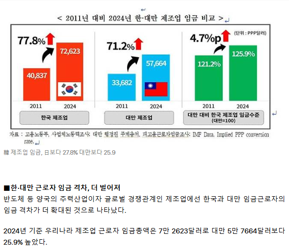 韓 제조업 임금, 日보다 27.8% 대만보다 25.9% 더 높다
