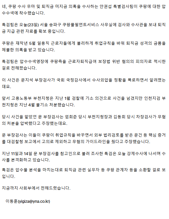 상설특검, 쿠팡 자회사 압수수색… '퇴직금 미지급' 수사 본격화