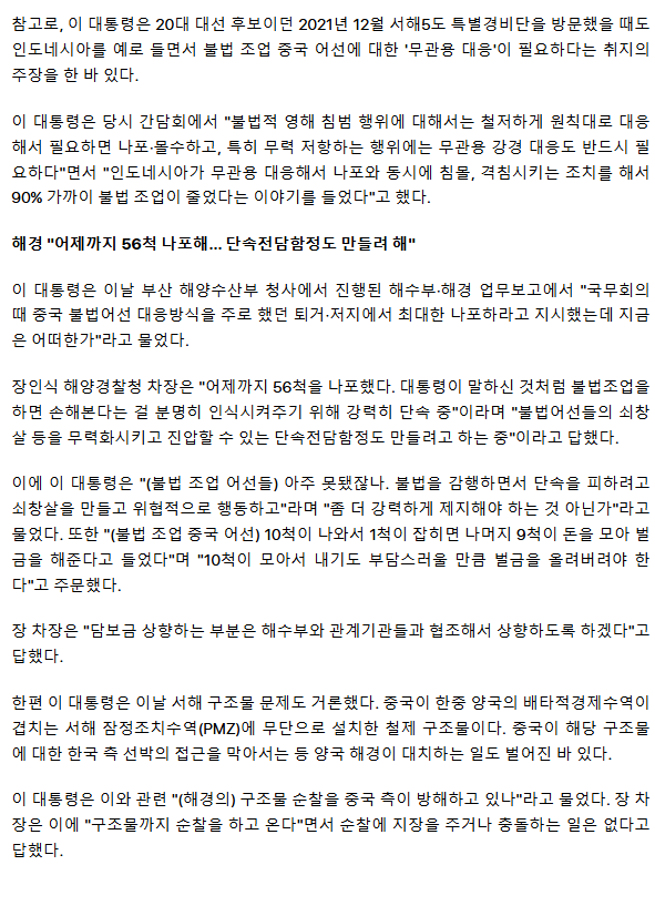 이 대통령 "불법조업 중국어선 아주 못됐다, 강력히 제재해야"