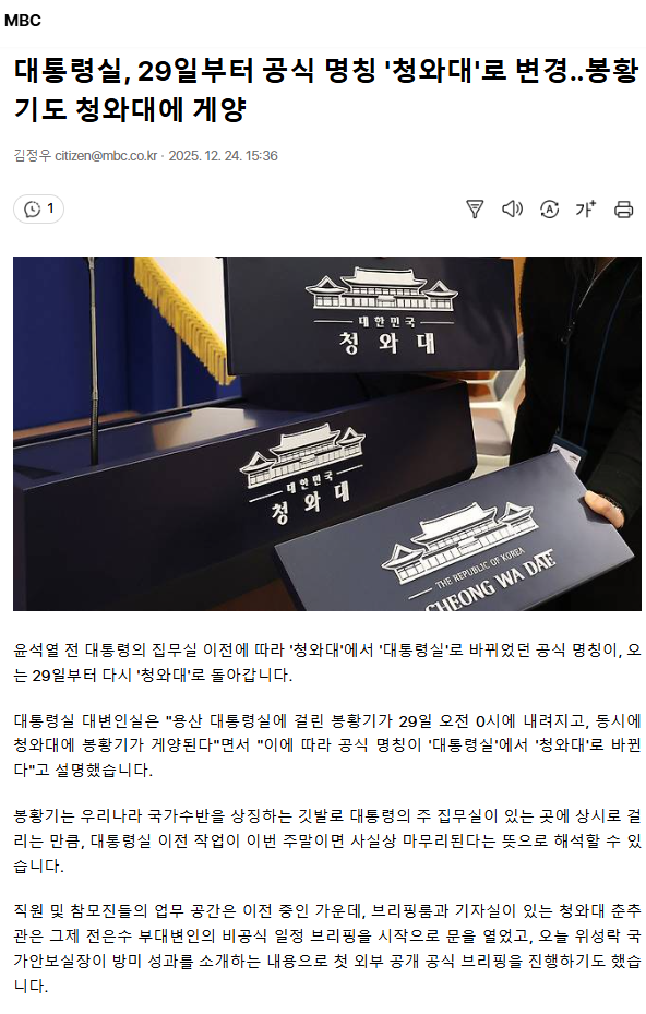 대통령실, 29일부터 공식 명칭 '청와대'로 변경‥ 봉황기도 청와대에 게양