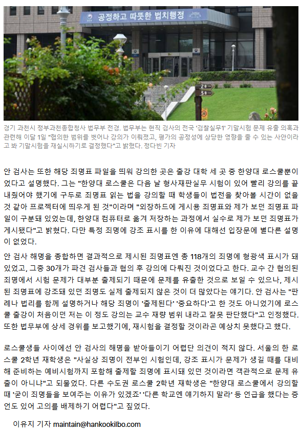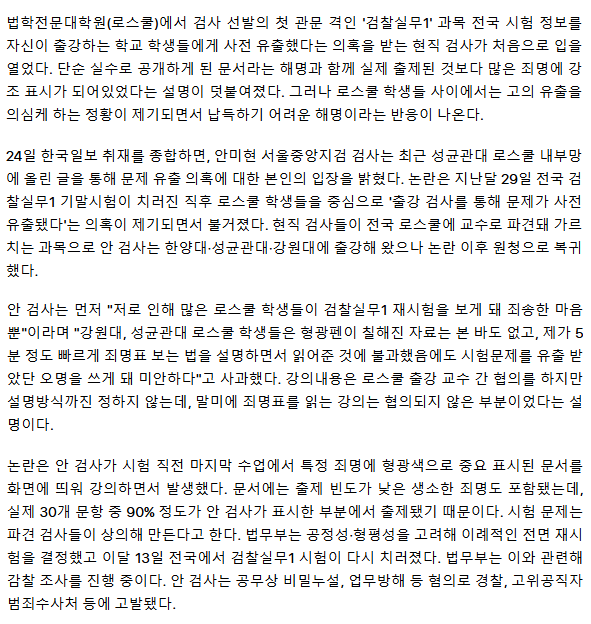 [단독] '로스쿨 문제 유출 의혹' 현직 검사의 해명과 사과… "실수로 교수용 파일 게시" ㅡ 안미현검사
