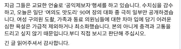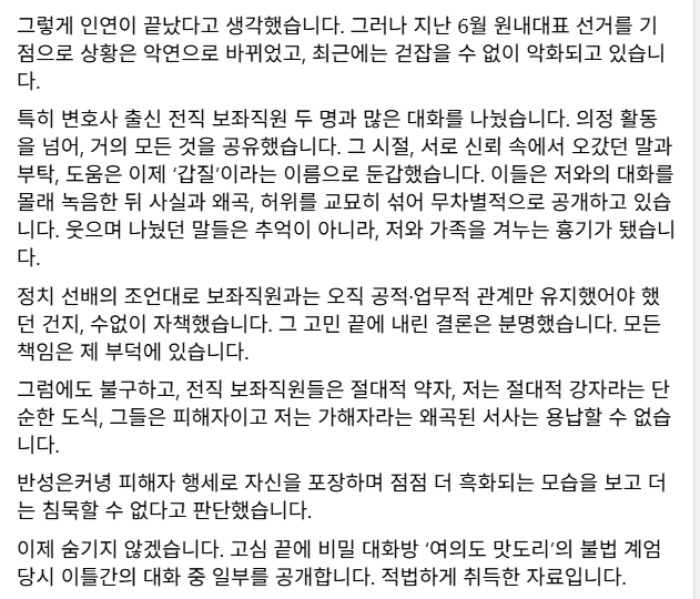 통일교 특검 먼저하고 최민희의원 장경태의원 먼저 사퇴하시고 난 다음에 계엄후에 "계엄을 하려면 제대로, 국회의원 다 체포하고" 막말 도촬 김민석의원 비하발언까지 한 전직비서관들의 피해자 코스프레에 넘어가면 안되죠 또 변협 정무이사까지 하고 계시던데