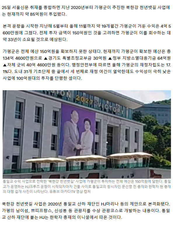 [단독] ‘통일교 페리’에 150억 투입해 고작 4억 회수… 가평군 특혜 의혹