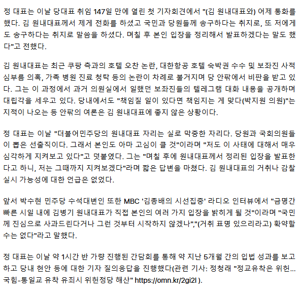 정청래 "김병기 사태 매우 심각하게 봐... 대표로서 국민께 사과"ㅡ 민주당에서 출당시켜라