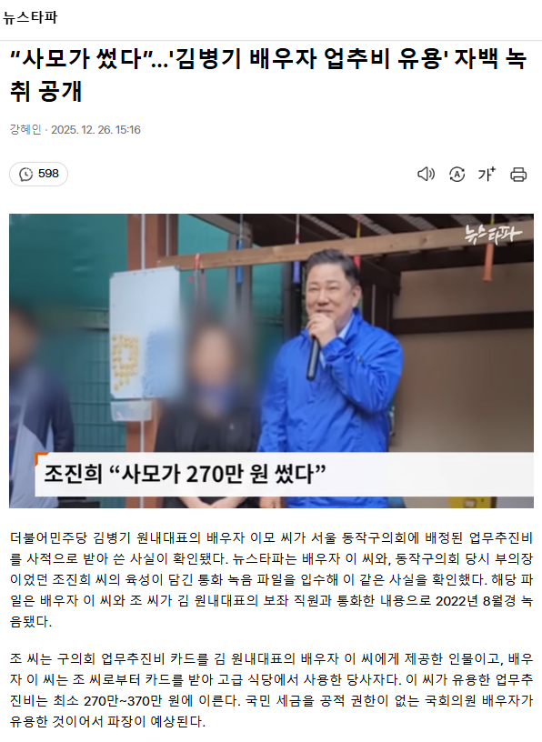 “사모가 썼다”… '김병기 배우자 업추비 유용' 자백 녹취 공개 ㅡ 부부가 범죄 연루 의혹