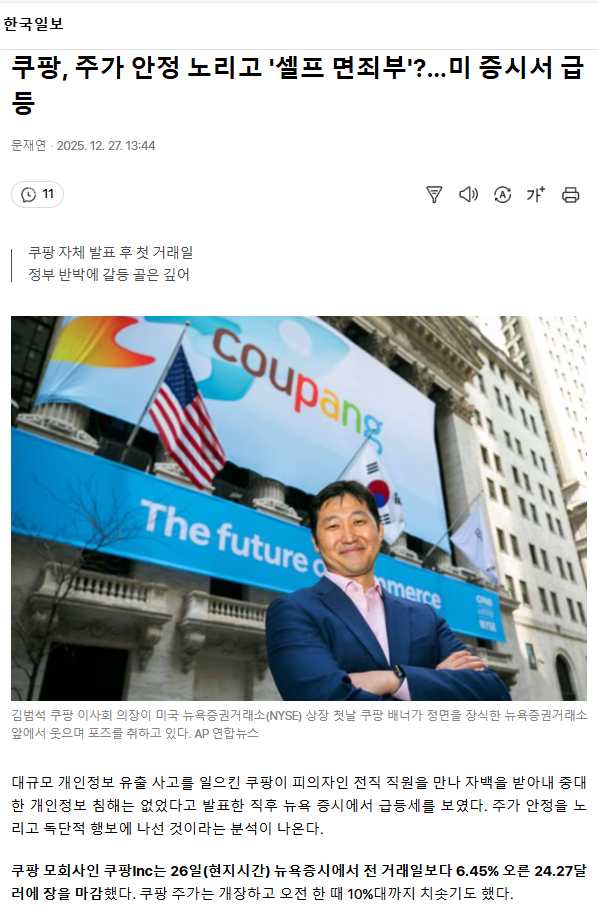 쿠팡, 주가 안정 노리고 '셀프 면죄부'?… 미 증시서 급등
