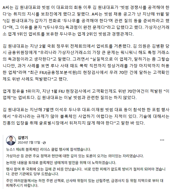 [단독] 김병기, 차남 빗썸 취업하자··· “경쟁사 두나무 공격할 질의 준비해” 지시 ㅡ 지위를 이용해서 꼼꼼히도 해먹었네