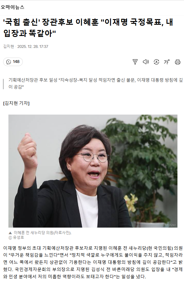 '국힘 출신' 장관후보 이혜훈 "이재명 국정목표, 내 입장과 똑같아"