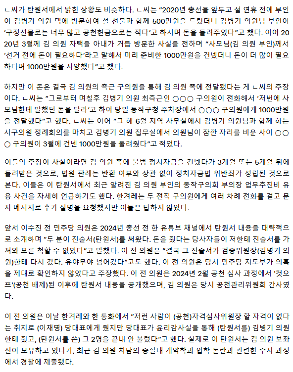 [단독] “김병기 쪽에 2천만원·1천만원 줘… 새우깡 쇼핑백에 돌려받아”
