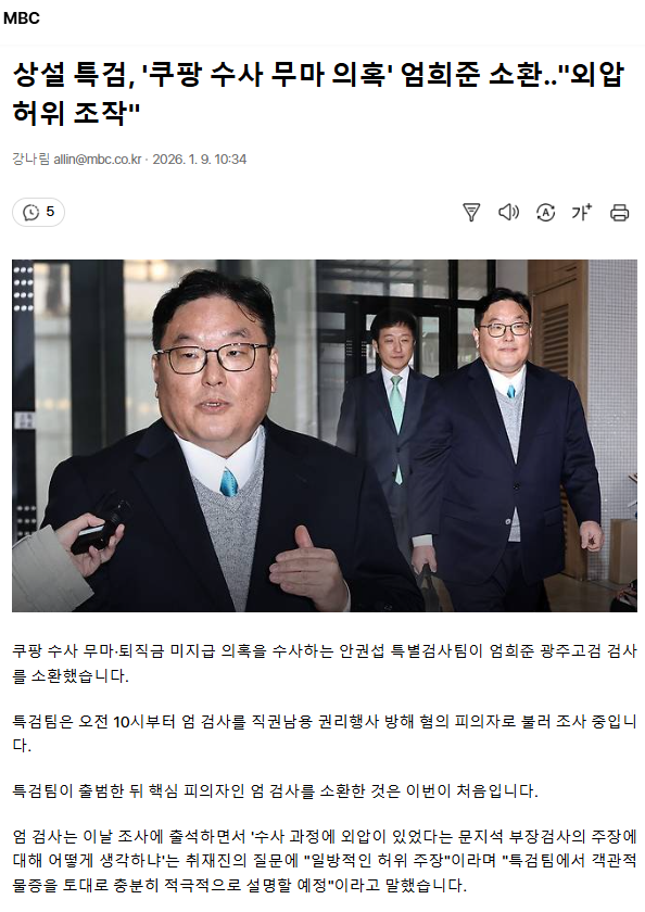 상설 특검, '쿠팡 수사 무마 의혹' 엄희준 소환‥ "외압 허위 조작"