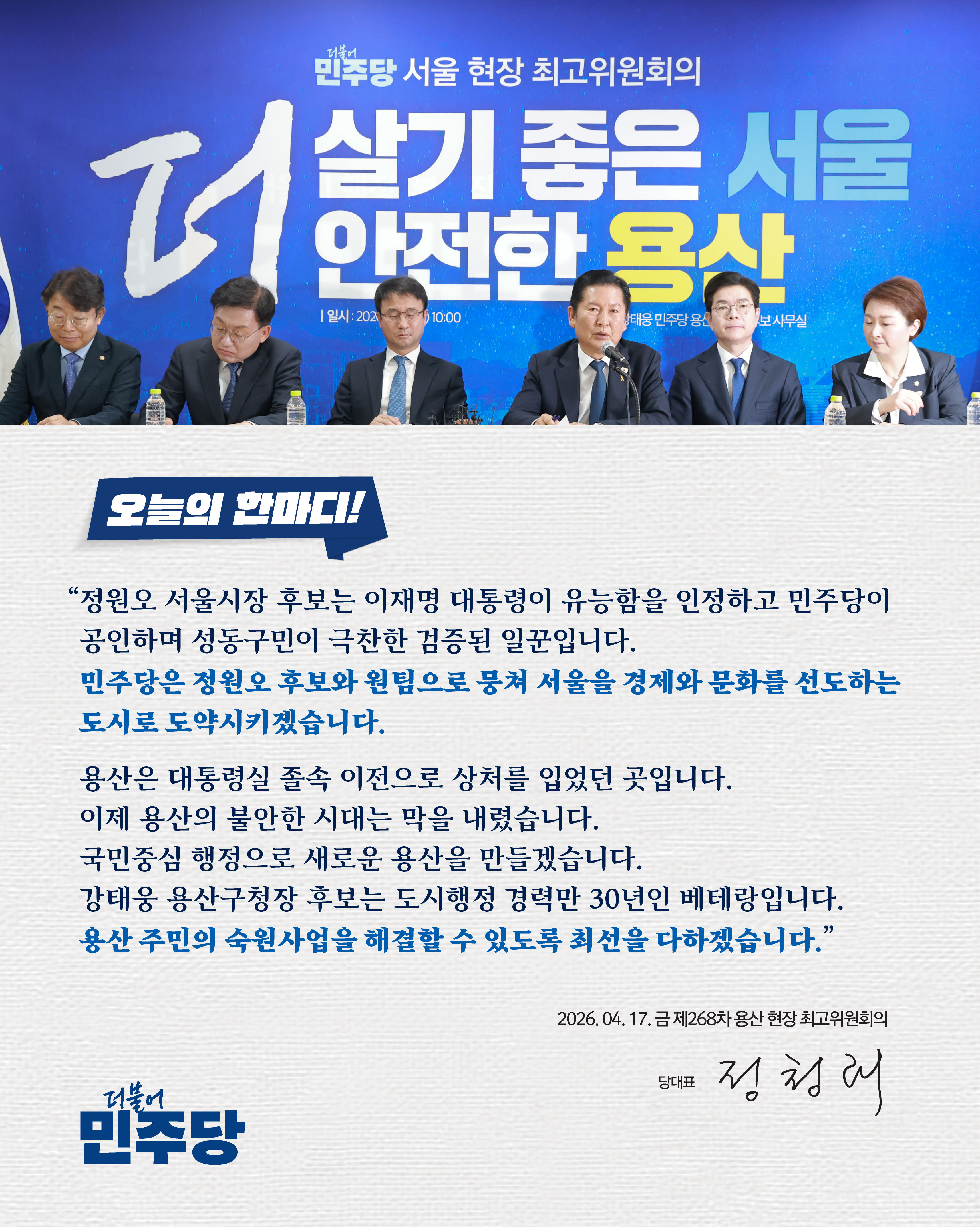 제268차 서울 용산구 현장 최고위원회의 모두발언 □ 일시 : 2026년 4월 17일(금) 오전 10시□ 장소 : 강태웅 용산구청장 후보 선거사무소 ■ 정청래 당대표 윤석열의 용산 시대를 마감하고 강태웅의 용산 시대를 우리는 맞이해야 합니다. 이렇게 말하면 대통령하고 용산구청장하고 어떻게 같이 비교하냐고 생각할 텐데, 윤석열은 강태웅 구청장 후보보다도 못하기 때문에 이렇게 비교합니다. 윤석열 정권 3년 동안 용산은 몸살을 앓았고 용산의 명예도 많이 실추되었다고 생각합니다. 현장 최고위원회의를 다니는데 서울의 다른 데가 아니라 용산에 온 것도 윤석열의 용산 시대를 과감하게 청산하고 새로운 용산 시대를 열고자 하는 민주당의 의지를 담았습니다. 새로운 변화를 맞이하고 있는 용산에서 현장 최고위원회의를 열게 되어 참으로 감회가 새롭습니다. 시작하기에 앞서 우리 당의 서울시장 후보로 확정되신 정원오 후보님도 함께했고 점퍼도 착용했습니다. 정원오 후보께 더 살기 좋은 서울을 위해 힘써달라는 당부의 의미를 담아 방금 파란 점퍼를 전달했습니다. 정원오 후보는 이재명 대통령이 유능함을 인정하고 민주당이 공인하며 성동구민이 극찬한 검증된 일꾼입니다. 서울 유일의 3선 구청장으로서 성동의 기적을 일궈낸 성공한 행정가이기도 합니다. 시민의 삶을 살뜰히 살피는 디테일, 주민과 막힘없는 소통, 강력한 실행력까지 겸비해 구정 만족도에서 독보적인 기록을 세운 분입니다. 조만간 우리 정원오 구청장이 일군 성동의 기적의 현장 성수동을 같이 방문할 예정입니다. 이런 실력자를 서울시장 후보로 세우게 되어 참으로 든든합니다. 정원오 후보가 이재명 정부의 실용주의 정신을 계승해 시민이 주인인 서울을 더 발전한 서울을 만들 적임자라고 확신합니다. 민주당은 정원오 후보와 원팀으로 똘똘 뭉쳐 서울을 경제와 문화를 선도하는 도시로 반드시 도약시키겠습니다. 용산은 한때 대통령실 졸속 이전으로 큰 생채기를 입었던 곳입니다. 갑작스러운 이전은 주민들에게 교통 체증과 생활 불편을 안겼고 각종 규제로 인한 개발 지연이라는 고통까지 더해졌습니다. 이태원 참사라는 잊을 수 없는 아픔까지 겪어야 했습니다. 이제 용산의 불안한 시대는 막을 내렸습니다. 대통령실이 청와대로 복귀하며 용산은 온전히 용산 구민의 품으로 돌아왔습니다. 오늘 최고위원회의는 그 변화를 현장에서 확인하고 용산의 아픔을 치유하겠다는 민주당의 약속입니다. 국민 중심 행정으로 새로운 용산을 만들겠습니다. 특히 다시는 이태원 참사와 같은 비극이 반복되지 않는 안전한 대한민국을 만들어야 합니다. 어제 이재명 대통령께서는 세월호 12주기 기억식에서 ‘어떤 상황에서도 국민을 지켜내고 온전히 의지할 수 있는 나라를 만들겠다’고 강조하셨습니다. 이재명 정부와 민주당은 생명안전기본법 제정을 포함해 국가안전관리 체계 혁신에 전력을 다해 국민의 생명이 최우선인 나라를 반드시 증명해 보이겠습니다. 이번 지방선거는 용산의 발전을 일궈낼 절호의 기회입니다. 이 자리에 함께하신 강태웅 용산구청장 후보는 도시 행정 경력만 30년에 달하는 베테랑입니다. 서울시 행정1부시장과 기획조정실장을 거치며 용산의 현안을 누구보다 정확히 꿰뚫고 있는 준비된 구청장, 용산 전문가입니다. 우리 강태웅 후보에게도 큰 박수를 한 번 보내드리겠습니다. 용산에서 이기면 서울시 전체에서도 저희가 이길 거라고 생각합니다. 준비된 강태웅 구청장 후보께서 열심히 잘해 주실 것을 믿어 의심치 않습니다. 정원오와 강태웅 두 분은 서울과 용산을 바꿔 놓을 최강의 드림팀 원팀입니다. 민주당은 두 후보와 함께 차돌처럼 똘똘 뭉쳐 용산·서울·정부가 하나로 움직이는 삼각 협력 체계를 가동하겠습니다. 용산 국제업무지구 개발, 용산국가공원 조성 등 주민의 숙원 사업도 해결할 수 있도록 최선을 다하겠습니다. 서울과 용산의 밝은 미래를 위해서 여러분께서 함께해 주시리라 믿습니다. 민주당이 실천하고 성과로 보답하겠습니다. 윤석열 정권 정치 검찰 조작 기소 진상 규명 국정조사 특위가 전 국민적 관심 속에 진행되고 있습니다. 검찰의 만행과 악행이 속속 드러나고 있습니다. 쌍방울 대북 송금 사건은 조작되었고 대장동 사건 또한 검찰의 이재명 사냥이 오로지 목표였다는 증언들이 공분을 자아내고 있습니다. 천인공노할 검찰의 만행을 보며 이 모든 시련을 다 견뎌내고 지금 대한민국 국가 정상화와 대한민국 국격을 드높이는 이재명 대통령을 생각하게 합니다. 국정조사장에서 쌍방울 대북 송금, 조작 기소, 진술 세미나, 연어 술 파티, 형량 거래라는 단어들이 튀어나오고 ‘리호남은 필리핀에 없었다’는 국정원 증언 등이 있었습니다. 북한의 리호남이 필리핀에 없었다는 사실은 대북 송금이 사실이 아니었다는 결정적 증언입니다. 돈을 받은 사람이 돈을 준 현장에 없었다는 것은 돈을 주거나 받은 사실이 없다는 것 아니겠습니까. 그렇다면 쌍방울 대북 송금은 없었다는 것이고 그렇다면 대북 송금 사건은 검찰이 만들어낸 사건이라는 것 아니겠습니까. 천인공노할 검찰의 악행입