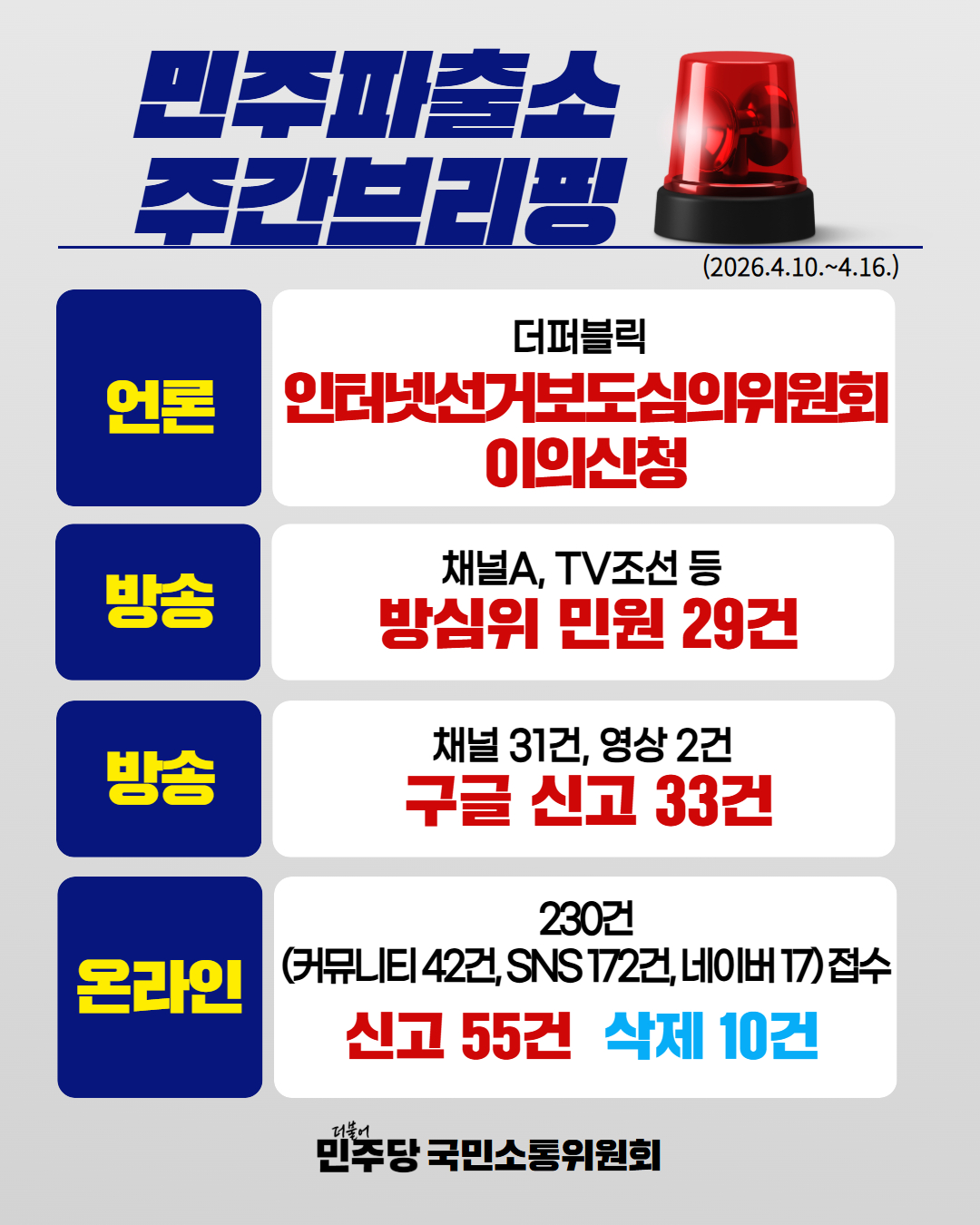 더불어민주당 국민소통위원회 민주파출소 주간브리핑(4. 17, 금) 안녕하십니까. 더불어민주당 국민소통위원회 위원장 김현 입니다. 4월 17일 금요일, 민주파출소 주간 주요 대응 현황 브리핑 시작하겠습니다. 민주파출소 제보 현황에 대해 보고드립니다. 4월 17일 00시 기준으로 한 주간 2,469명이 방문하였고, 588건의 제보가 접수되었습니다. 누적 건수로는 총 773,667명이 민주파출소를 방문하였고, 총 227,815건의 제보가 접수됐습니다. 매체별로 온라인이 275건 제보되어 가장 많고, 유튜브 100건, 네이버 40건 순으로 제보됐습니다. 민주파출소 주요 대응 현황 보고드립니다. 언론 대응 보고입니다. 트루스데일리의 3월 5일자 및 9일자 보도와 관련하여 언론중재위원회 심리를 진행하였으나, 피신청인 측의 불참으로 기일이 속행되었습니다. 더퍼블릭의 4월 15일자 보도에 대해서는 선거에 영향을 미치려는 보도로 판단하여 인터넷선거보도심의위원회에 이의신청을 접수하였습니다. 방송 대응 보고입니다. 시사 프로그램, 뉴스, 라디오를 모니터링한 결과, 더불어민주당의 입장을 대변할 수 있는 출연자가 배제된 채 방송이 진행된 사례가 다수 확인되었습니다. 이에 따라 관련 규정 위반 소지가 있는 29건에 대해 방송미디어통신심의위원회에 심의를 요청했습니다. 유튜브 대응 보고입니다. 이재명 대통령 및 현 정부 정책과 관련하여 비난, 허위 사실을 유포하는 유튜브 영상이 다수 확인 되었습니다. 이에 해당 영상을 포함한 총 31개의 채널과 2개의 영상을 신고 조치하였습니다. 온라인 대응 보고입니다. 온라인 부문 제보는 커뮤니티 41건, SNS 172건, 네이버 17건으로 총 230건이었으며, 커뮤니티 11건, SNS 42건, 네이버 2건을 플랫폼에 신고 조치하였습니다. 이 중 민주당 정치자금 101억, 대통령 관련 허위조작정보 게시물 등 10건은 삭제되었습니다. 법적 대응 보고입니다. 국민소통위원회는 ‘추미애 더불어민주당 경기도지사 후보에 대한 허위 사실 유포 건’에 대해 정보통신망법 위반 혐의로 고발 조치하였습니다. 이상으로 대응 보고드렸습니다. 세월호 참사 12주기를 추모합니다. 희생자들의 명복을 빌며 유족과 생존자들께 깊은 위로를 전합니다. 최근 더불어민주당 당대표를 겨냥하여 '당비 101억 낭비설'이라는 악의적인 허위사실이 유포되었습니다. 그러나 이는 대선 당시 빌린 선거 자금 대출금을 정당하게 상환한 것으로, 명백한 허위입니다. 더불어민주당은 해당 사안에 대해 법적 조치를 취할 것임을 분명히 밝힙니다. 허위사실 조작 세력은 어떠한 근거와 증거, 논리도 없이 특정 상황이 발생하면 강제로 내용을 끼워 맞추는 조작 방식을 반복하며 국민을 기만하고 있습니다. 국민소통위원회는 이러한 악질적인 흑색선전에 대해 결코 좌시하지 않겠으며, 끝까지 추적하여 엄중한 책임을 묻겠습니다. 감사합니다. 2026년 4월 17일더불어민주당 국민소통위원회