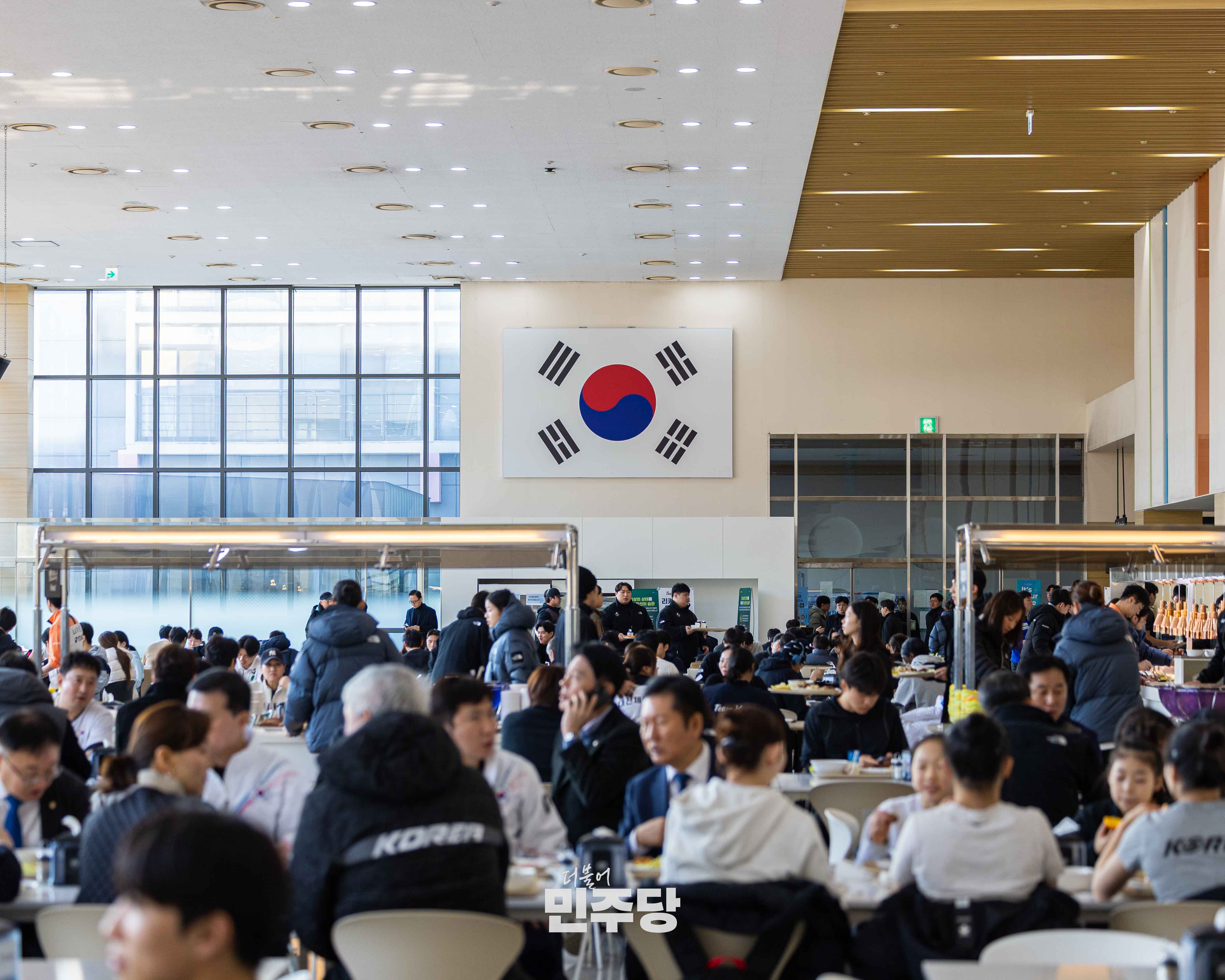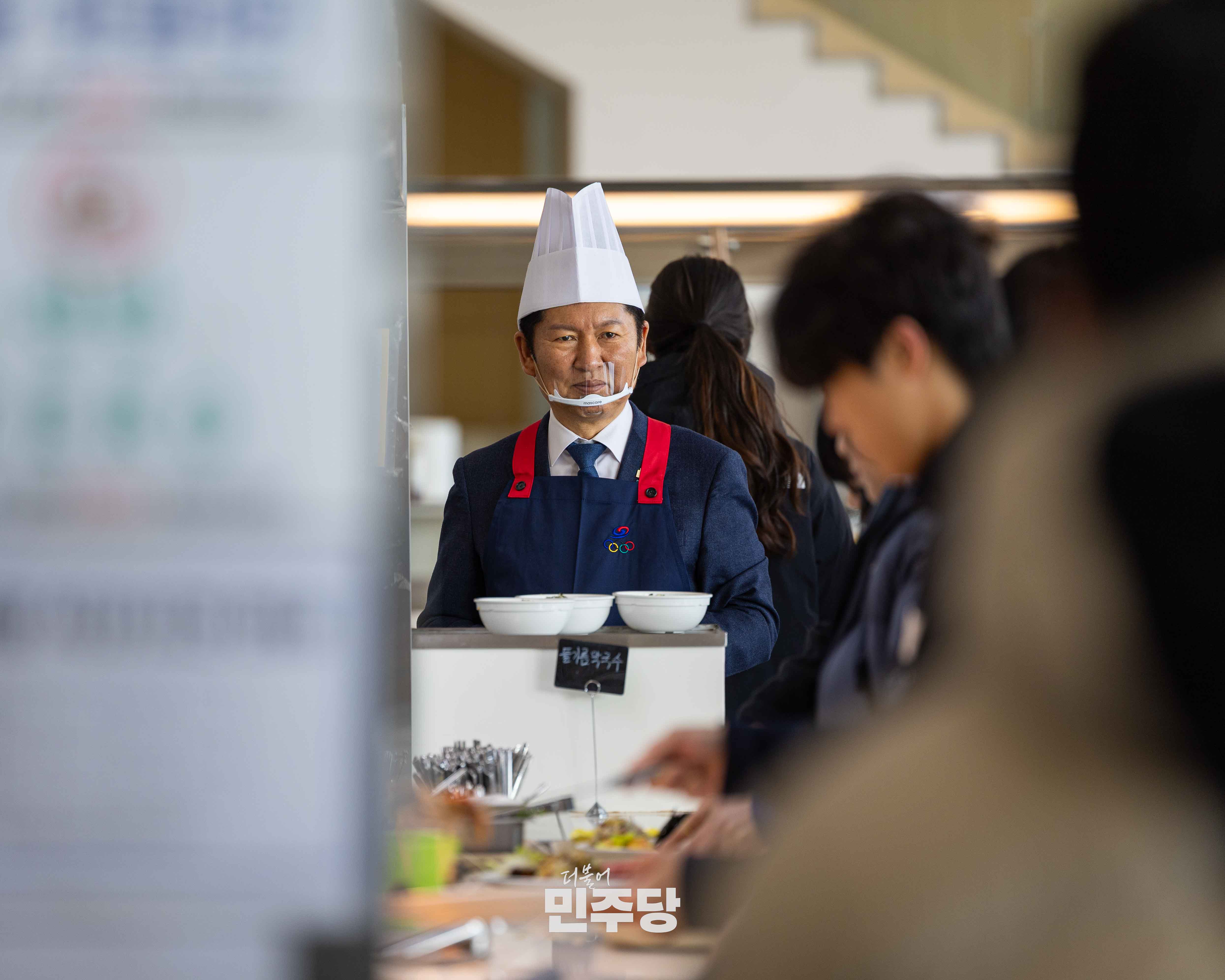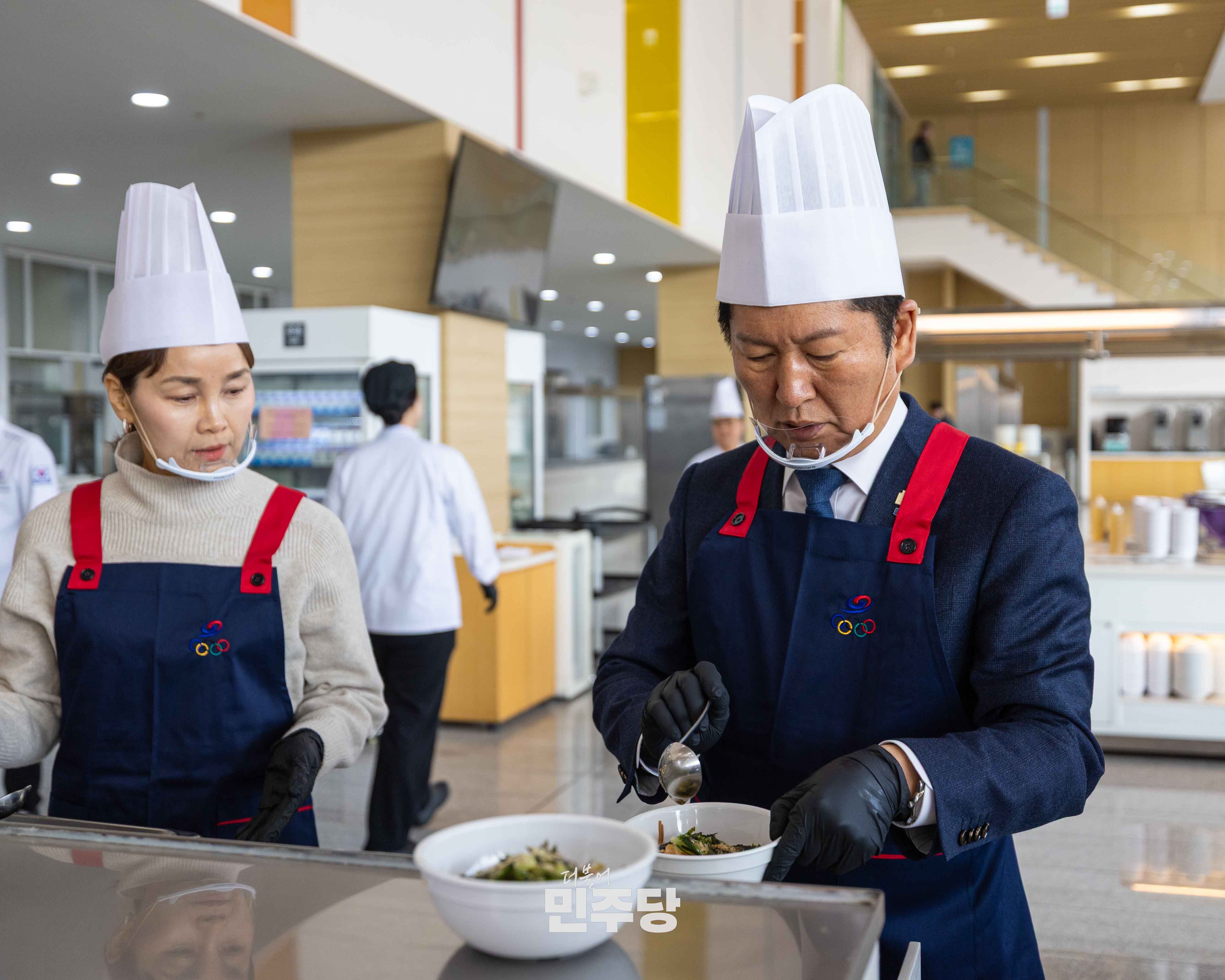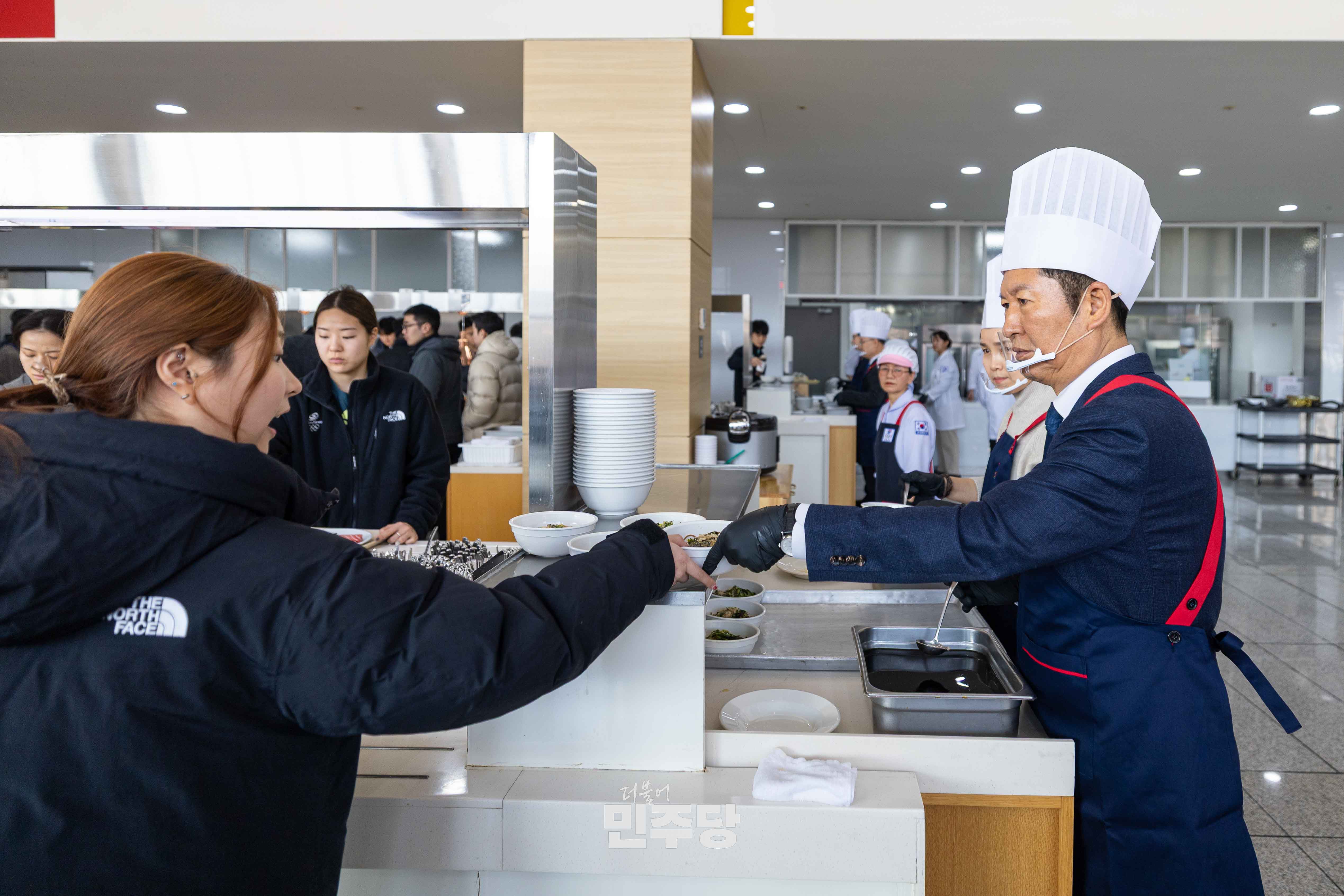 정청래당대표가 2026.01.23.(금) 충북 진천에 위치한 진천선수촌에 방문하여 선수식당에서 들기름막국수를 배식하고 선수들과 식사를 오찬을 하고 있다.