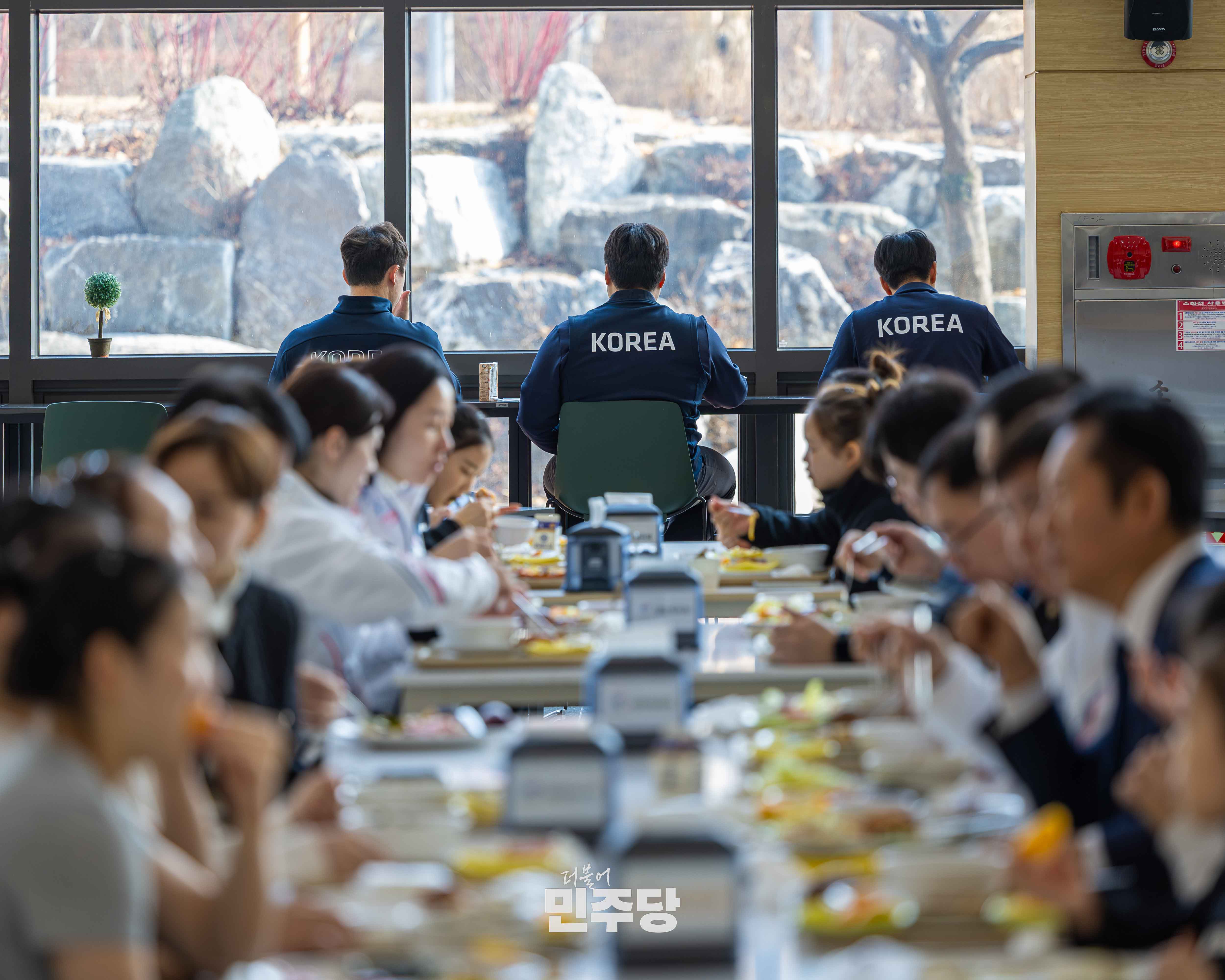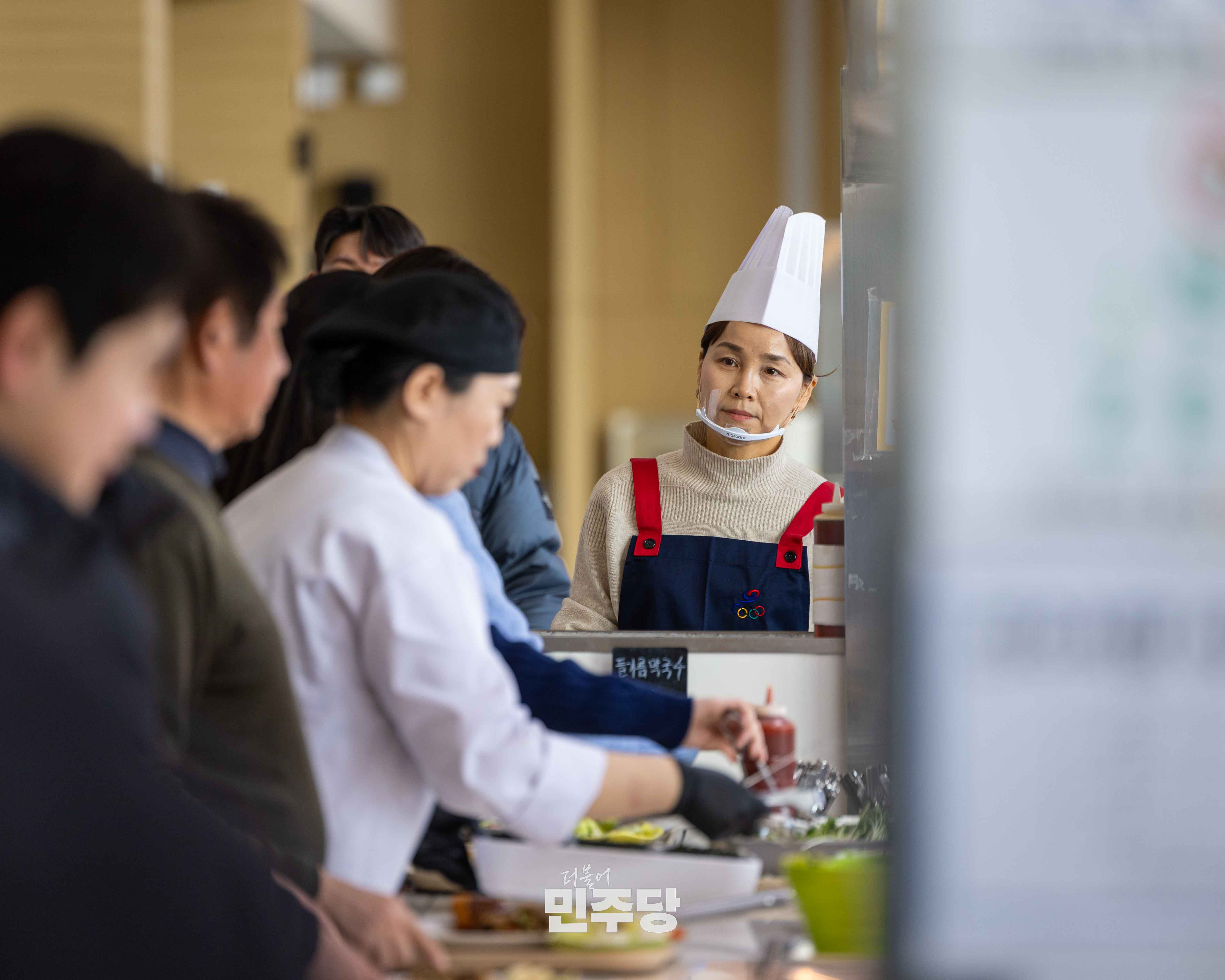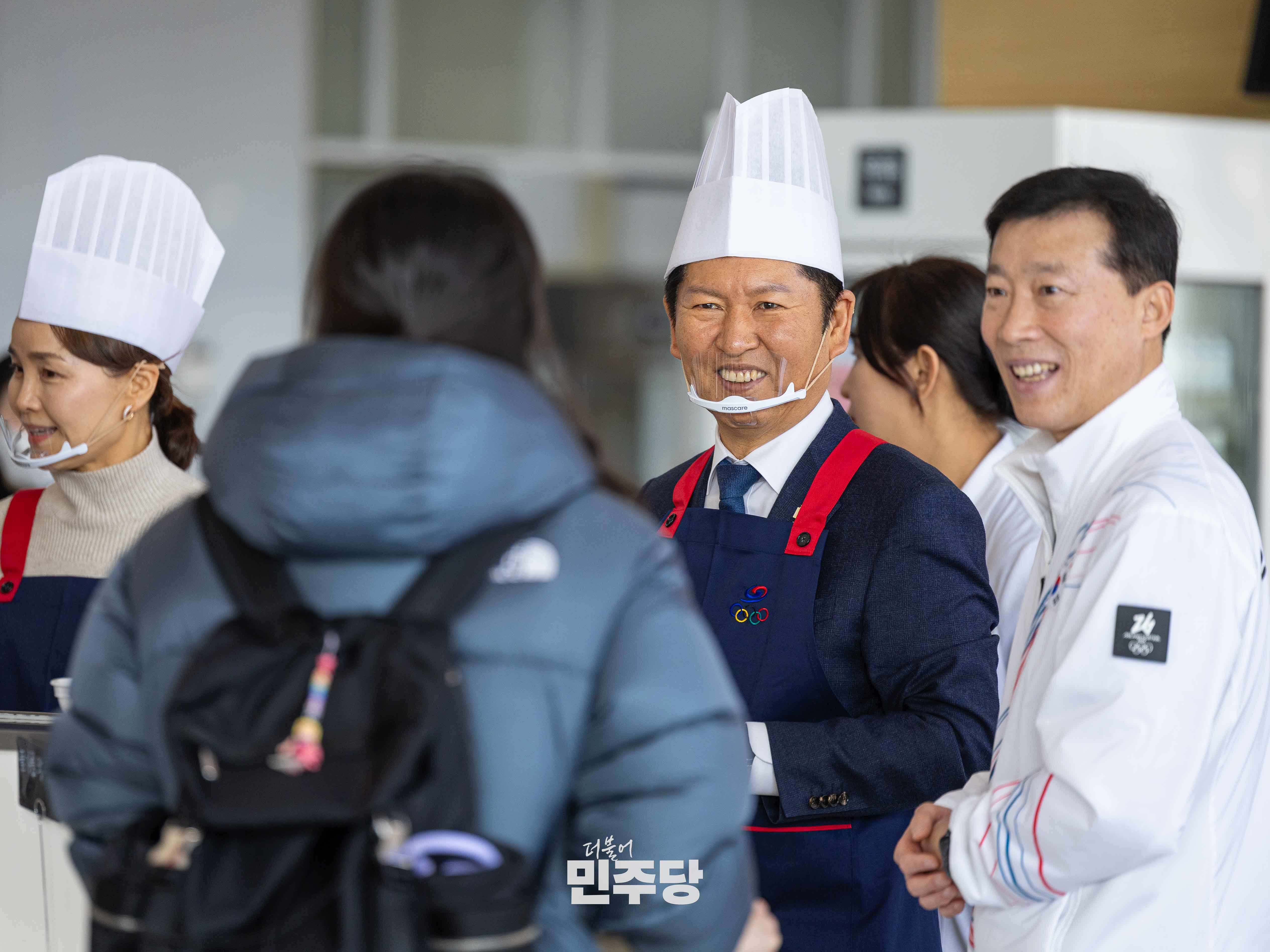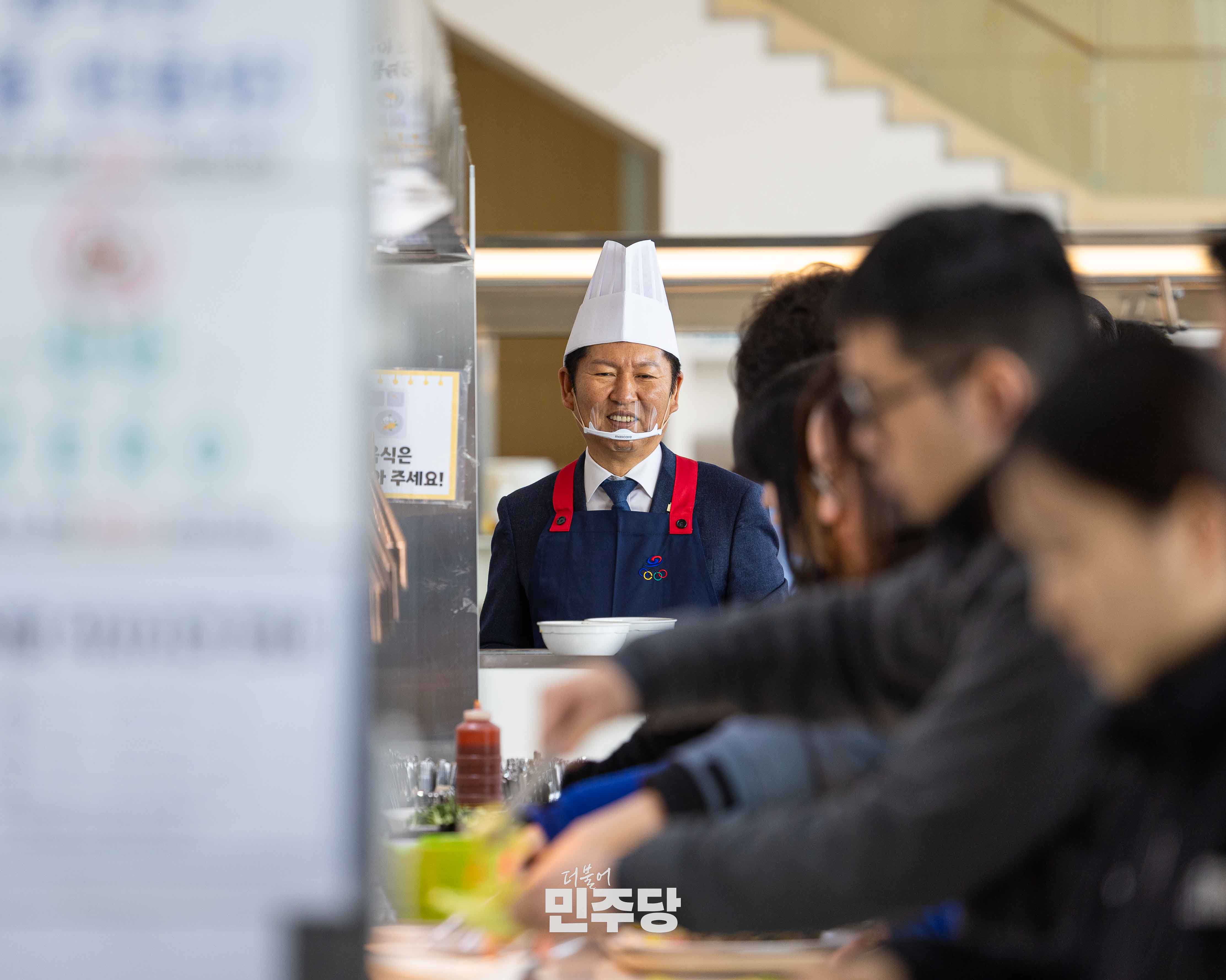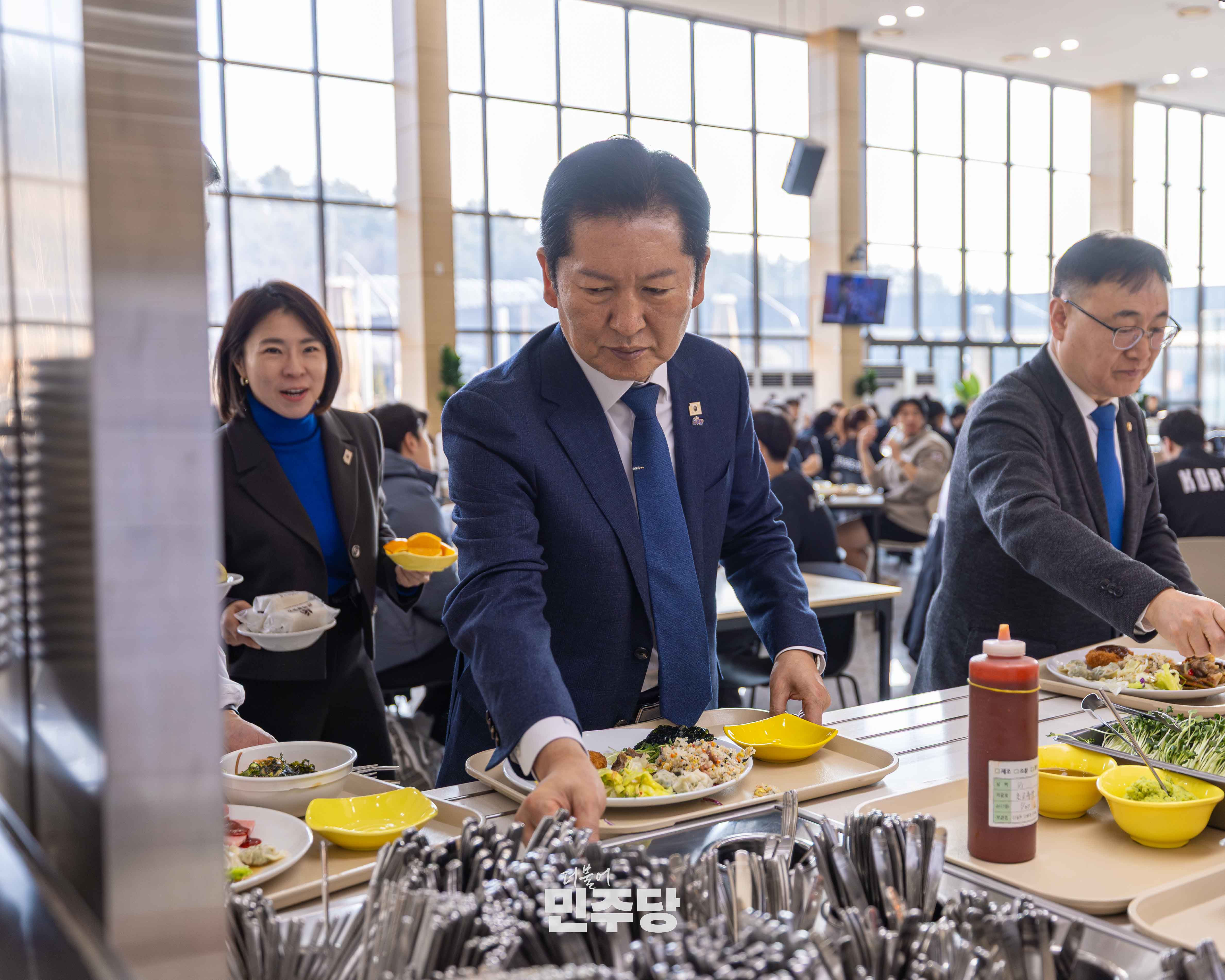 정청래당대표가 2026.01.23.(금) 충북 진천에 위치한 진천선수촌에 방문하여 선수식당에서 들기름막국수를 배식하고 선수들과 식사를 오찬을 하고 있다.
