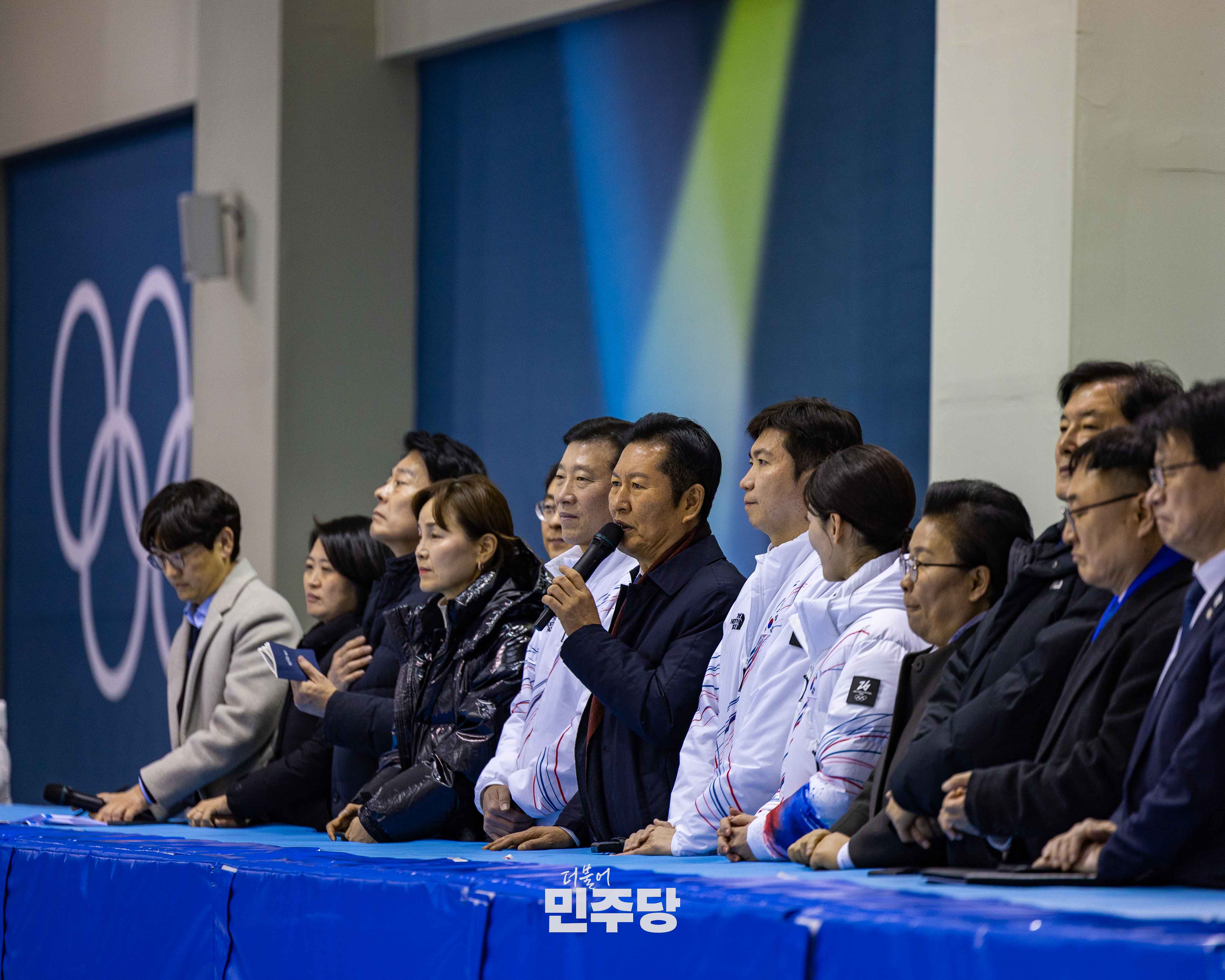 정청래 당대표가 2026.01.23.(금) 충북 진천군에 위치한 진천선수촌에 방문하여 쇼트트랙 선수단을 격려하고 기념촬영을 하고 있다.