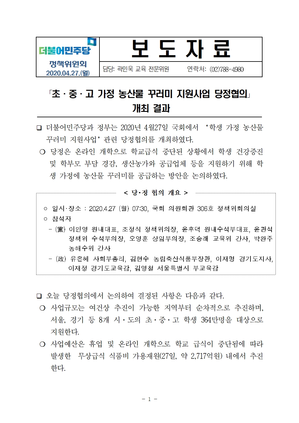 200427(보도자료)_초중고_가정_농산물꾸러미_지원사업_당정협의_결과(최종).hwp