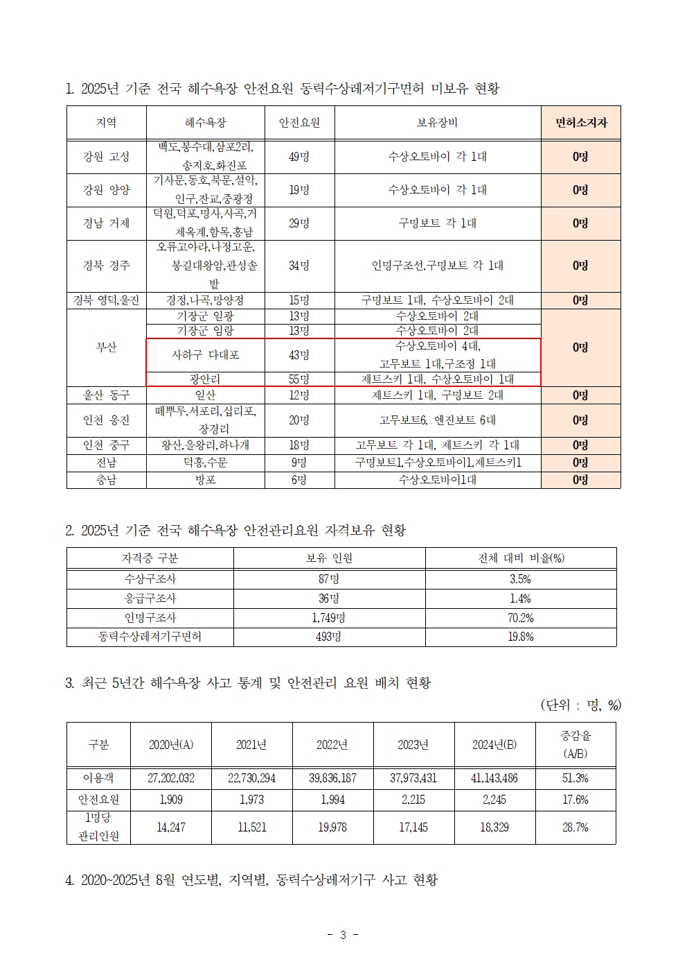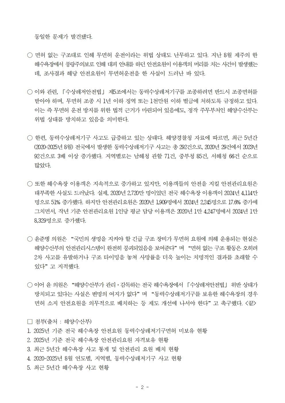 251015 [윤준병 의원 국정감사 보도자료] 전국 해수욕장 20% 안전시스템 붕괴 제트스키 있지만 면허는 없다.hwp