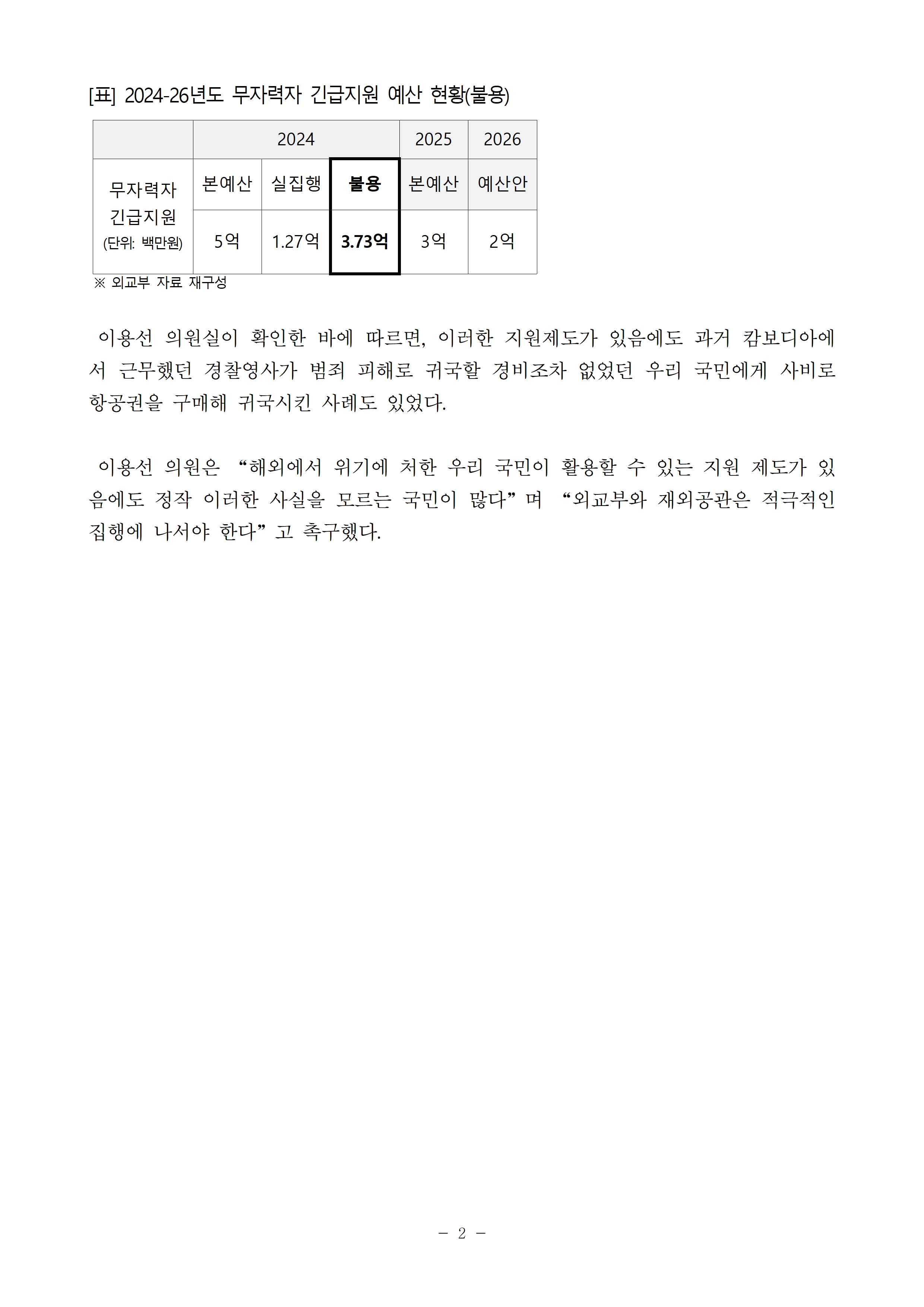 [이용선 국회의원 보도자료] 재외국민 보호‘국가 책무’라는데… 무자력자 긴급지원 예산 75% 불용
