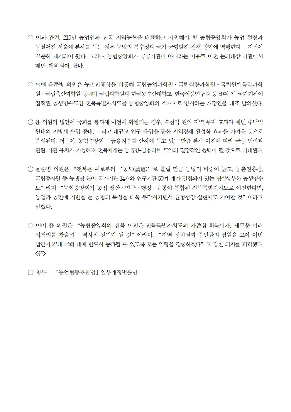 251028_[윤준병_의원_국정감사_보도자료]_윤준병_의원__균형성장_및_전북_대도약_위한_‘농협중앙회_전북_이전법’_발의!.hwp