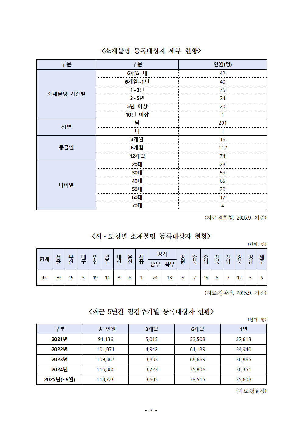 [국회의원 한병도 2025 국정감사 보도자료] 성범죄 신상정보 등록대상자 202명 소재불명... 120명은 1년 넘게 검거 못해