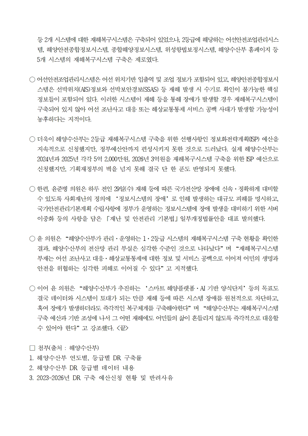 251030 [윤준병 의원 국정감사 보도자료] 해양수산부 중요성 높은 1·2등급 재해복구시스템 구축률 30% 밑돌아!.hwp