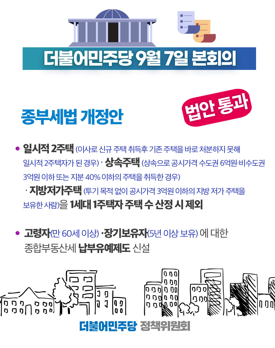 더불어민주당 9월 7일 본회의 종부세법 개정안 법안 통과