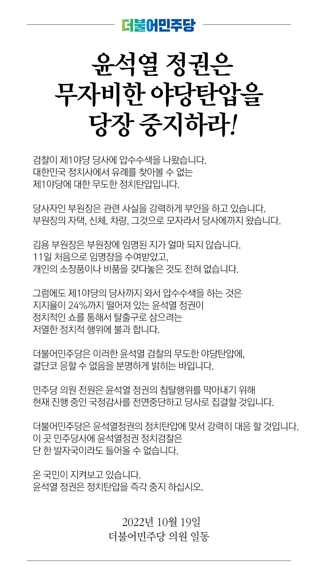윤석열 정권은 무자비한 야당탄압을 당장 중지하라!