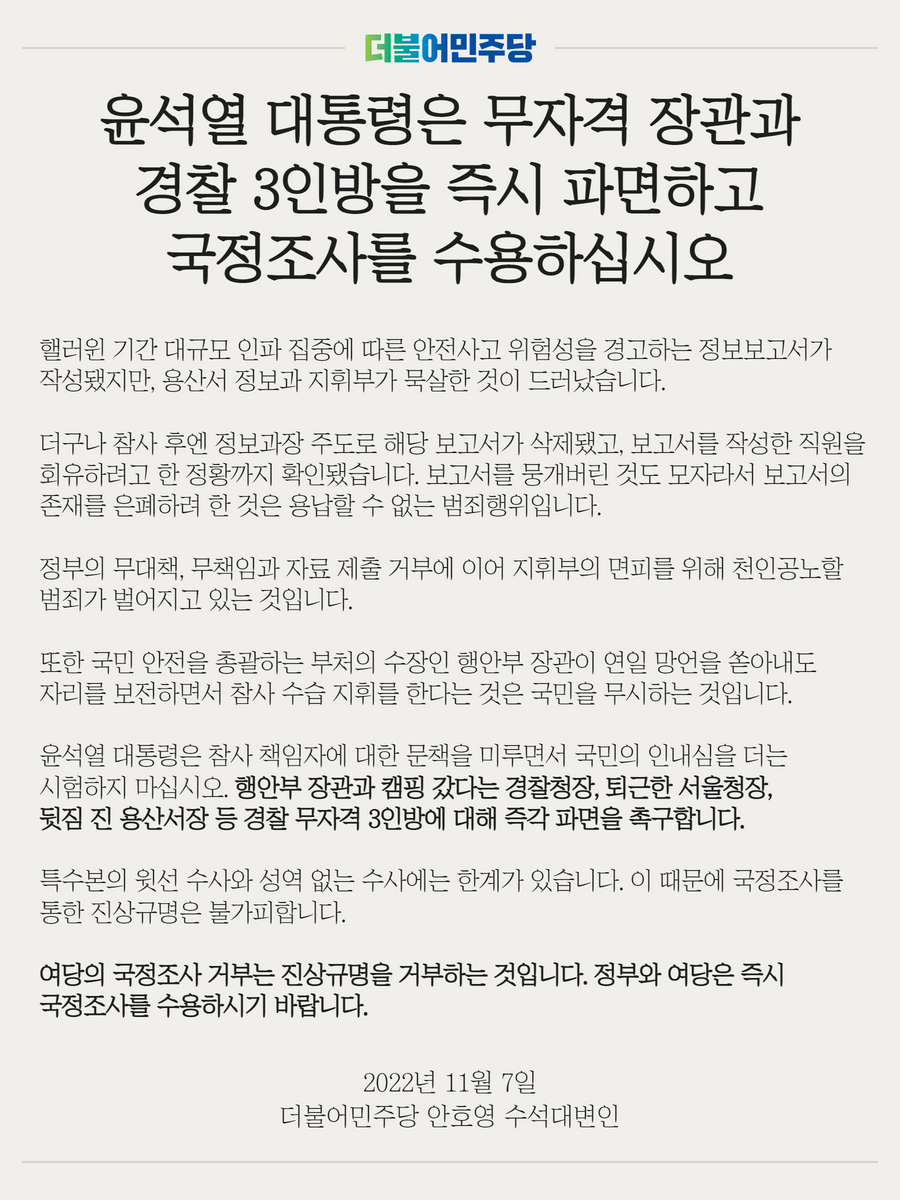 무자격 장관과 경찰 3인방을 즉시 파면하고 국정조사를 수용하십시오