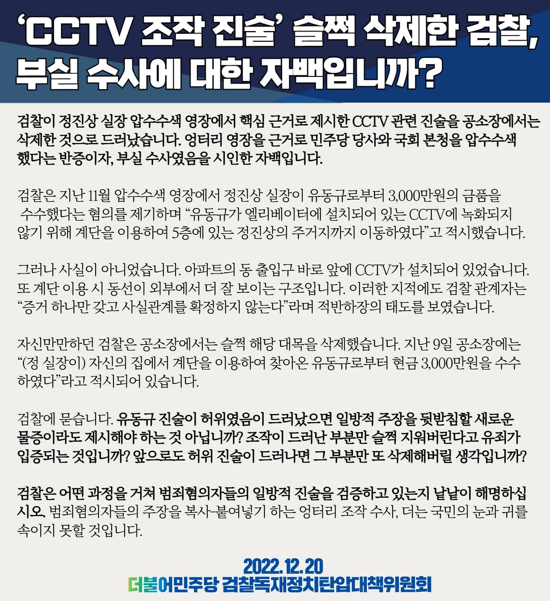 'CCTV 조작 진술' 슬쩍 삭제한 검찰, 부실 수사에 대한 자백입니까?