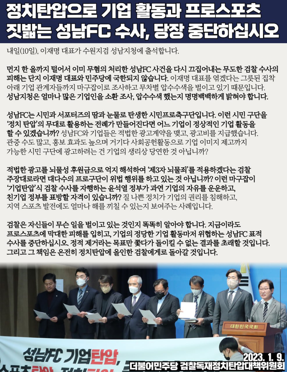 정치탄압으로 기업 활동과 프로스포츠 짓밟는 성남FC 수사, 당장 중단하십시오