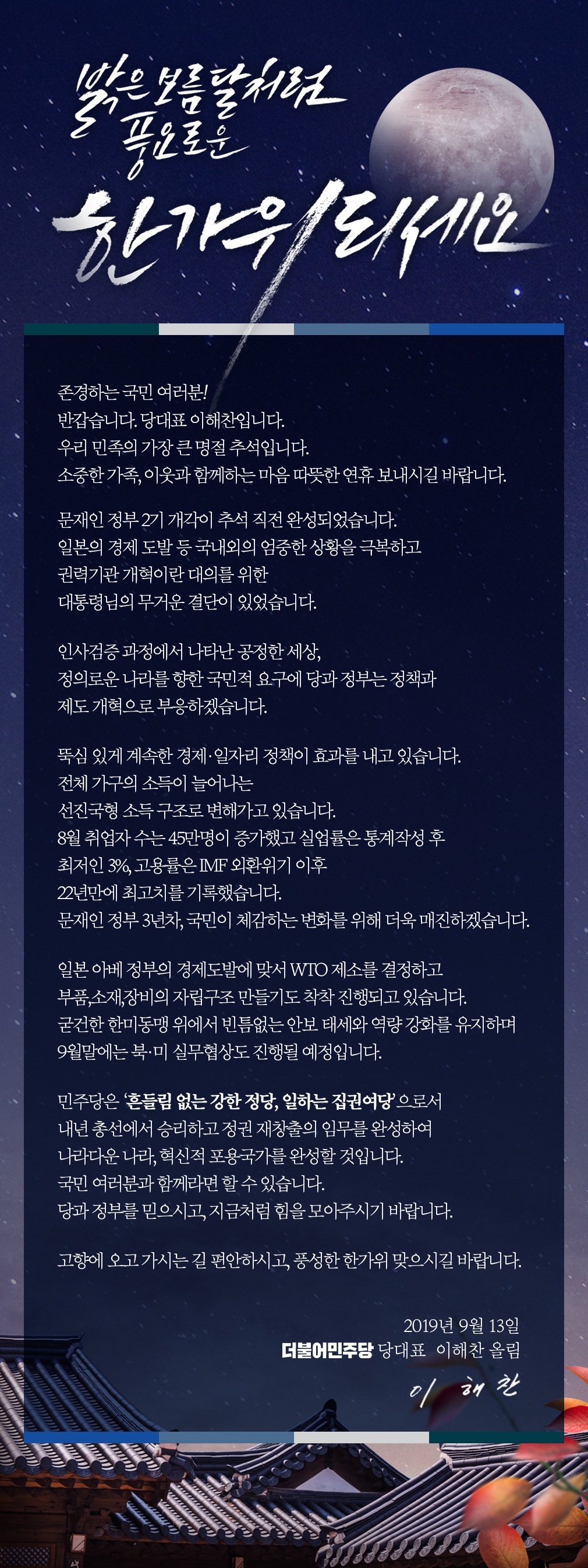 이해찬 당대표 2019년 추석 인사